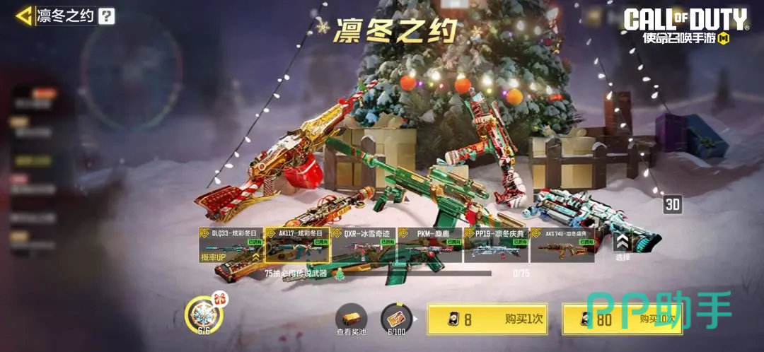 在本次活动中,一共会有6把凛冬系列传说级武器上线,DLQ33及AK117的冬日款、QXR-冰雪款、PKM-麋鹿、PP19-凛冬庆典、AKS 74U-凛冬盛典,是不是很让人期待。