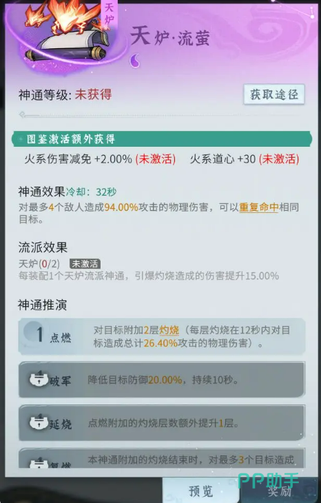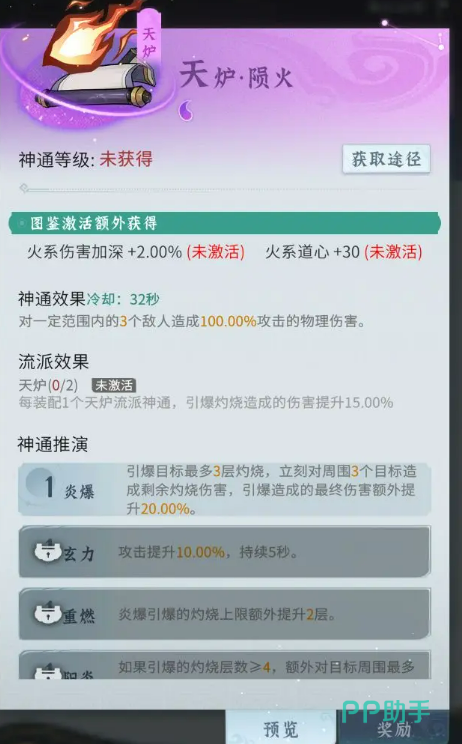 天炉流派的玩法则更偏向“灼烧引爆”,造成物理爆发伤害。相比离火的持续压制,天炉的特点是高频率的大范围爆炸清场。装备天炉系神通后,每多装备一个神通,引爆灼烧的伤害就会提升15%,可以说是输出效率拉满。核心神通推荐包括天炉·陨火,这是天炉流派的绝对核心神通,火流星砸下,直接引爆灼烧,是瞬间清场的利器。
