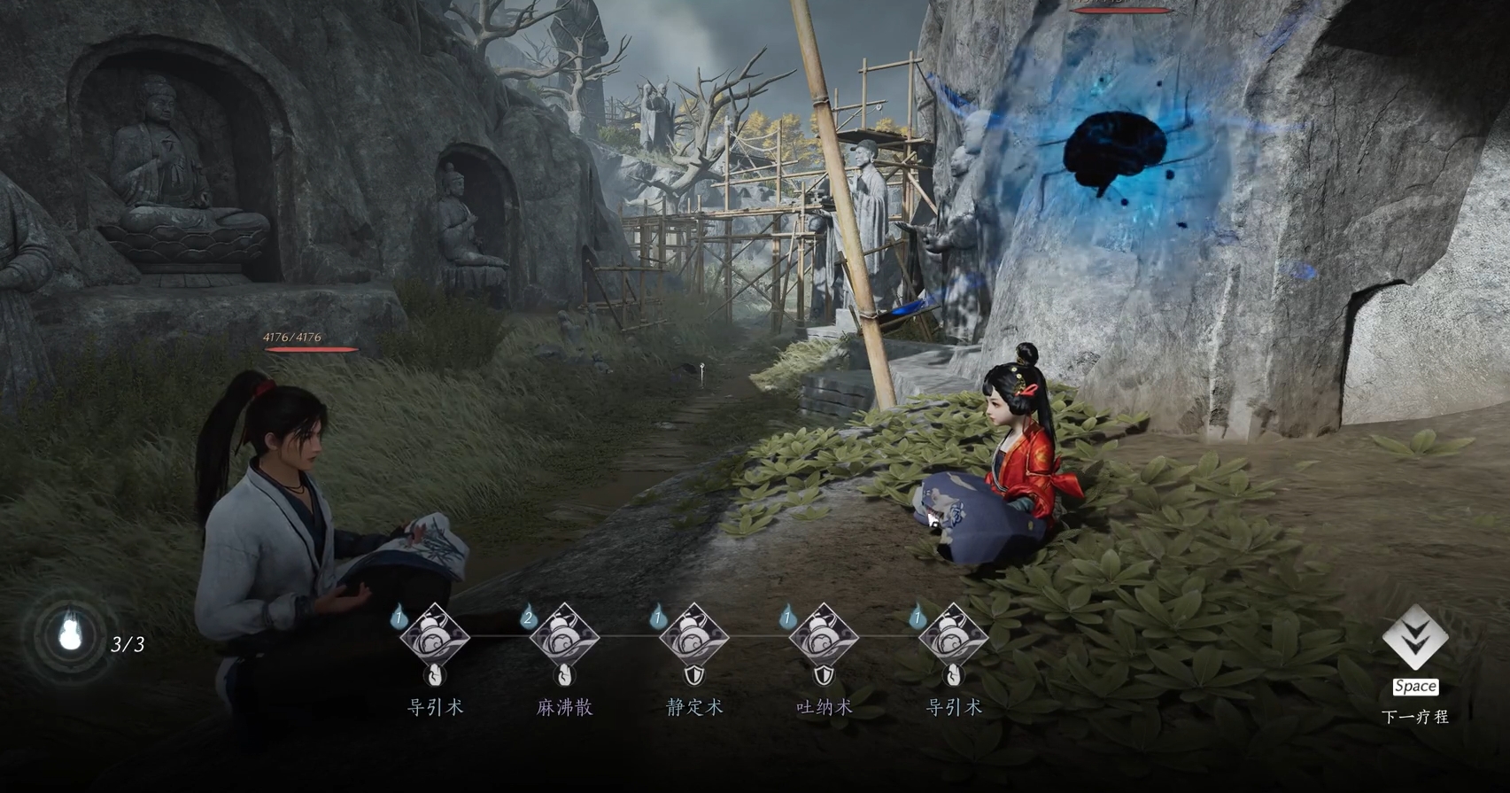 来到瓷窑后,人们可在宋九所在位置的附近的架子上找到时一墨,对话后会出现提示,让人们去千佛洞继续去寻找时一墨。这一回她会与千佛洞里的其它雕像一样在一个洞口处打坐,并在与玩家对话后突然身体感到不适。此时只要用悬壶医术将时一墨治好,她对玩家的态度就会改观不少,并告知玩家她要找的宝贝其实是颜色艳丽的蘑菇。