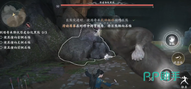 根据这两个点,我们先把没有连接的两根转动,这样就能把石盘给移动开来,再去转剩下的,全部完成后就可以解开机关进入石室,到里面就能看到boss,打它的时候需要注意,直接攻击对其是无法造成输出的,唯一的输出方式就是用乾坤挪移将它扔到石堆中攻击。