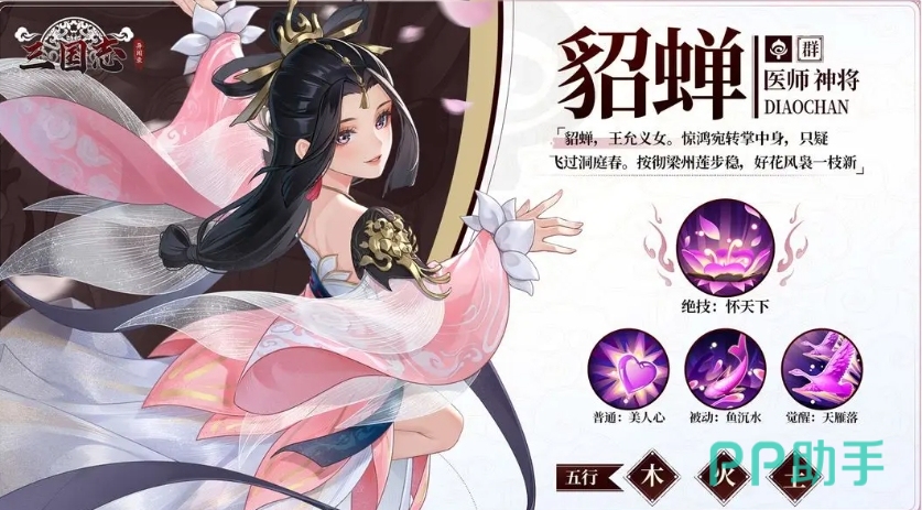 貂蝉的背景是王允义女,她属于群雄阵营,职业为医师,初始五行属性为木属性,这意味着她在效果上面偏奶,后面升级后中期可以激活火属性,达到百级后激活的才是土属性,因为游戏中的五行体系之间会互相克制,并且不同的五行属性具有不同的技能效果,而面对不同属性的敌人选择对其克制的五行属性会更快取得战斗胜利。