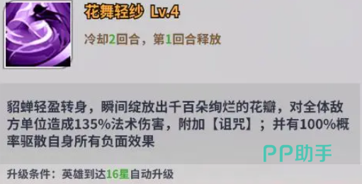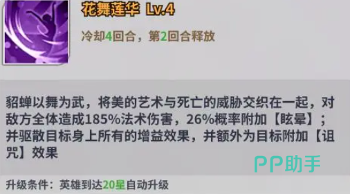 她的第二个主动技会翩翩起舞,随后对场上的所有敌人形成185%的法术输出值,这次攻击有26%的概率附带上眩晕让其两回合无法行动,并驱散掉目标身上的所有增益附加上一层诅咒。
