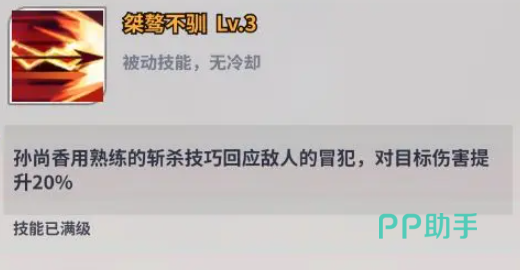 孙尚香的被动一“桀骜不驯”能将她对目标的伤害提升20%,她的被动二“枭姬”能让自己的攻击提高65%,生命值提升到34%,她的主动技一会从容的穿梭在敌方阵营中进行刺杀,从而对单体目标形成246%的物理伤害。