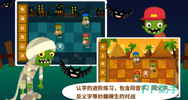 本作是款将汉字知识以及塔防僵尸元素融合起来的神奇游戏,小朋友可以通过合成认知汉字的方式抵抗可爱僵尸的入侵,玩法借鉴了著名的塔防游戏植物大战僵尸,创新的识字操作玩法和具体规则会激发孩子的认知能力,画面风格一如既往的卡通生动极具辨识度,很有亲和力的游戏内容也会让小朋友越玩越上头哦。