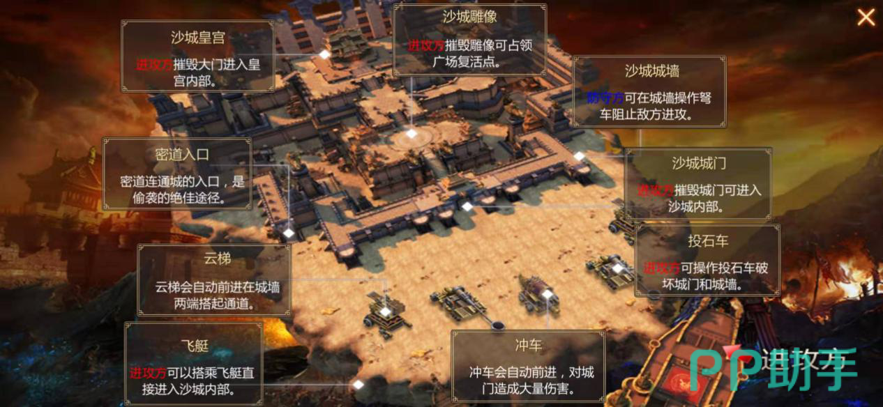 最后再说说沙城地图中的密道,密道共有一条,一个入口一个出口,入口在沙城城墙外的西南角,出后则在沙城内部的东北角。聪明的玩家应该都看出来了,这是一条直接攻往沙城内部的捷径,可以避过守城器械和守军,直接攻击敌人的要害。