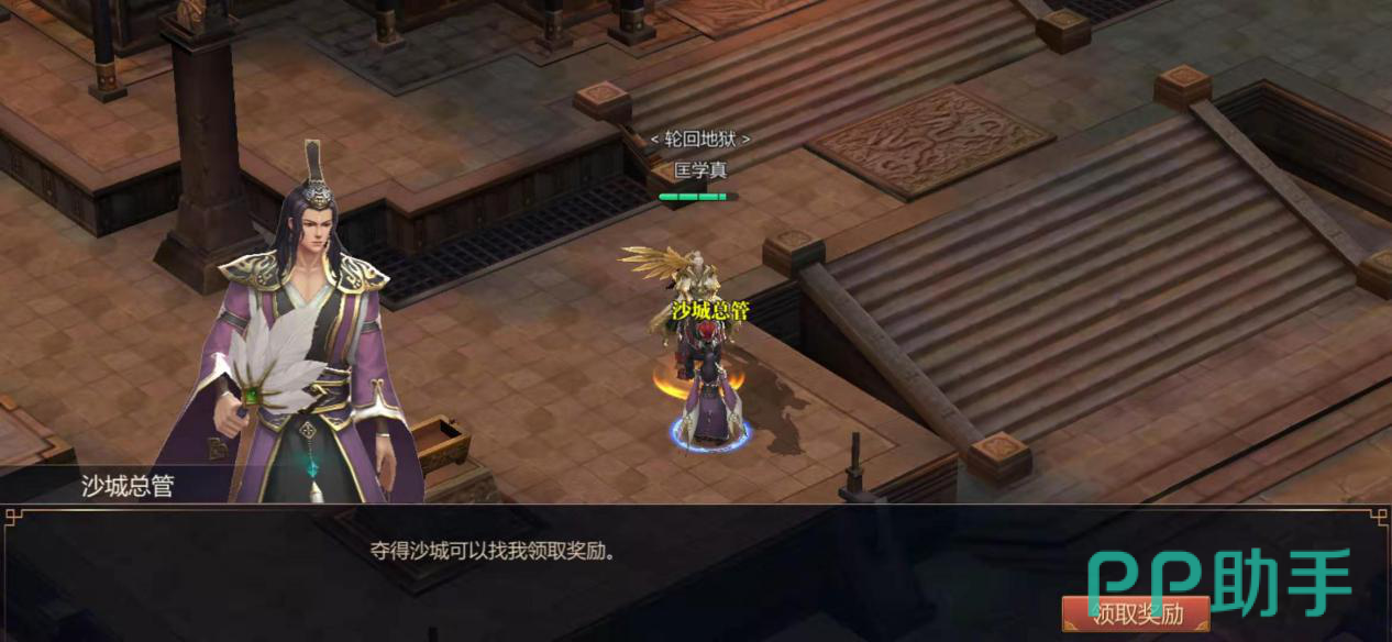 穿过广场一直向里走,就能看到皇宫的大门了,这里是沙城争夺战最激烈的地方,突破了大门就能攻击皇宫了,在皇宫大门旁边有沙城总管,攻占了沙城的行会成员可以在此领取丰厚的奖励。
