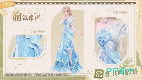 这套以浪花而模拟出的漂亮礼服,更是让人一眼就觉得叹为观止,从浅黄棕颜色的发丝间,就已经透露出了一丝丝的优雅,而裙子整体如真正飘浮的海浪一般,让人物浮沉于大海之中,双手的精致绣钻的袖套,更是显得整个人物高贵不已,最亮眼的地方在于腰间的浪花与贝壳相结合的设计,衬得人物宛如海中女王一般。