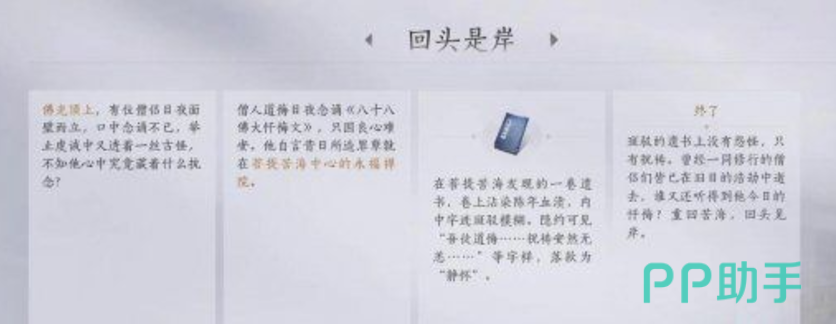 当回头是岸这个任务触发成功之后,玩家根据指引要去菩提苦海。到了以后在门外拾取到斑驳的遗书,其实斑驳的遗书是道具也是特别重要的。如果玩家成功的获得了斑驳的遗书,那么就需要去找柳道悔npc,然后跟他对话再提交任务,此时财代表任务的完成。