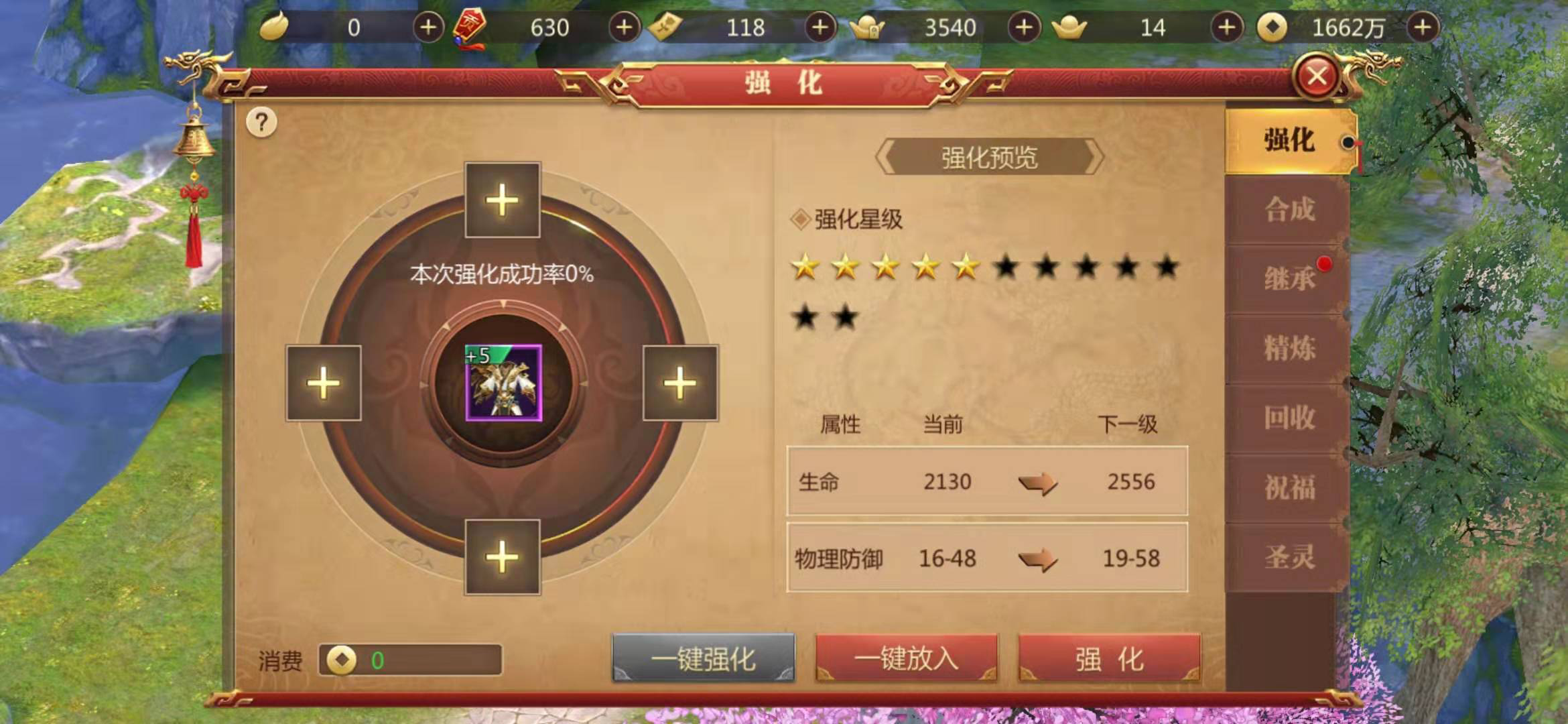 获得的原石在装备强化功能中的镶嵌选项中使用,我们为了通过新试练塔第100层,所选的原石都是生命和防御方向的。镶嵌后大大提高了生命值和五行防御值,这样第100层BOSS对我们造成的伤害就很小了。
