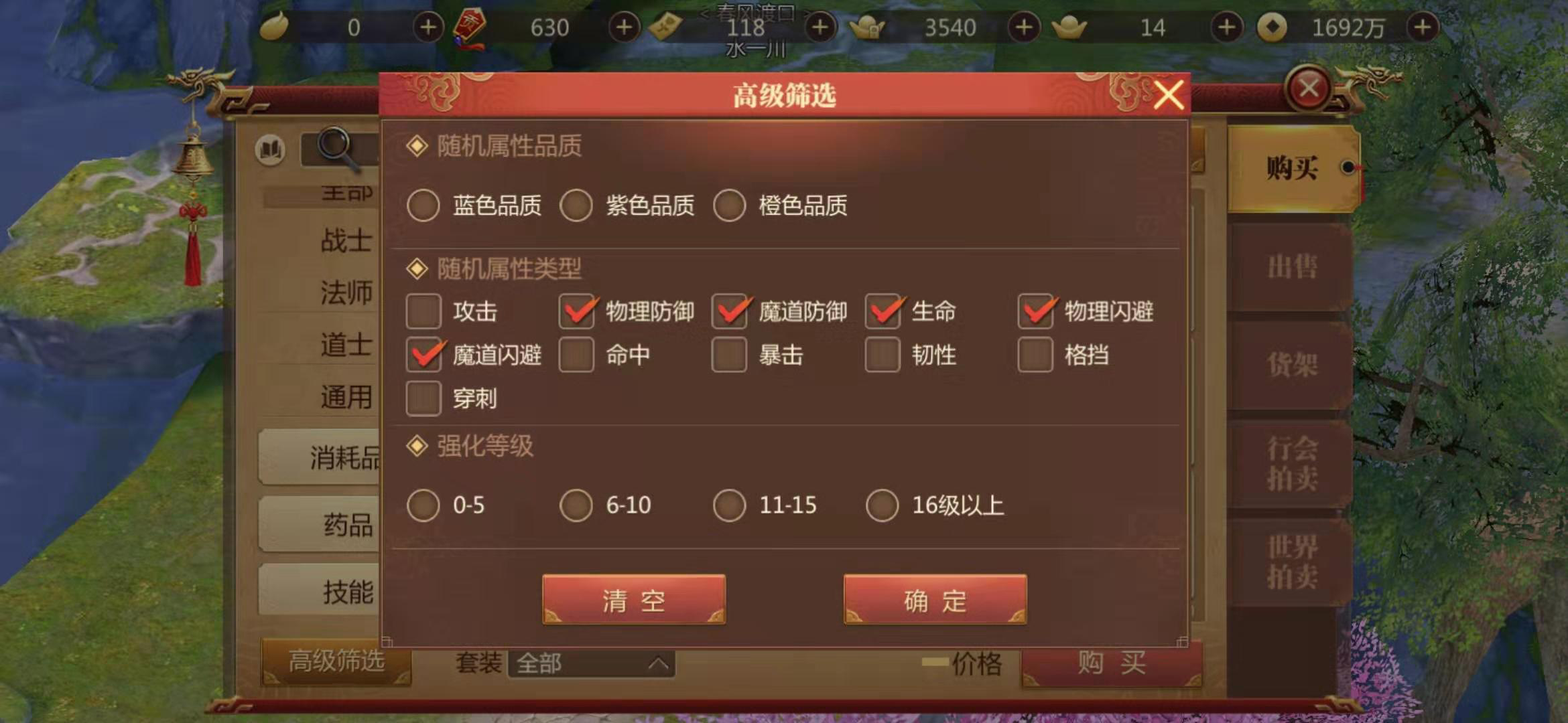生命值、闪避值和防御值可以通过更换装备来获得,在拍卖行中,选择装备栏目,然后在高级筛选功能中的随机属性上,在物理防御、魔道防御、生命和物理闪避、魔道闪避等选项上打钩,这样系统就会自动将符合要求的装备筛选出来了。我们可以在其中挑选性价比最好的来购买。