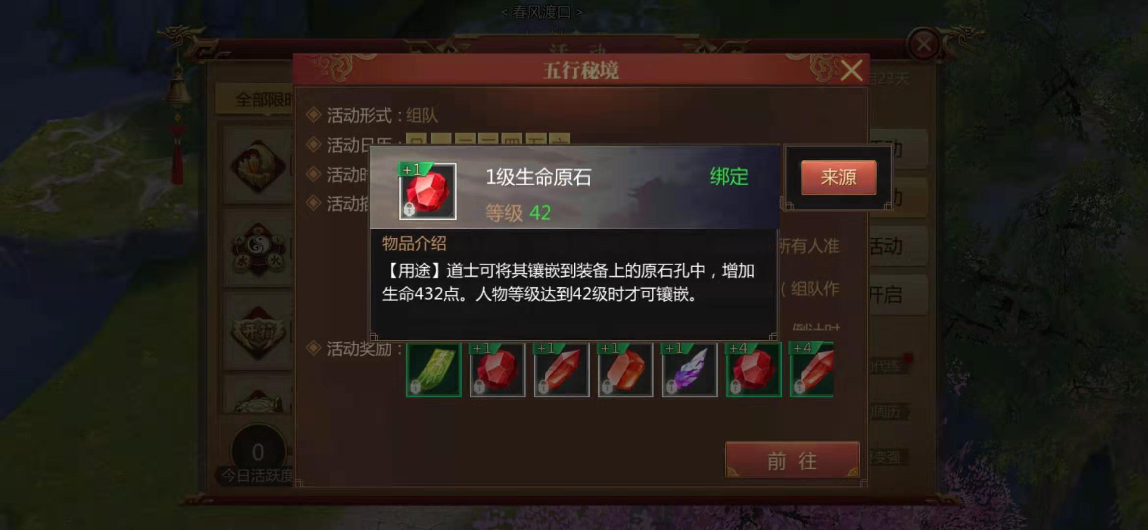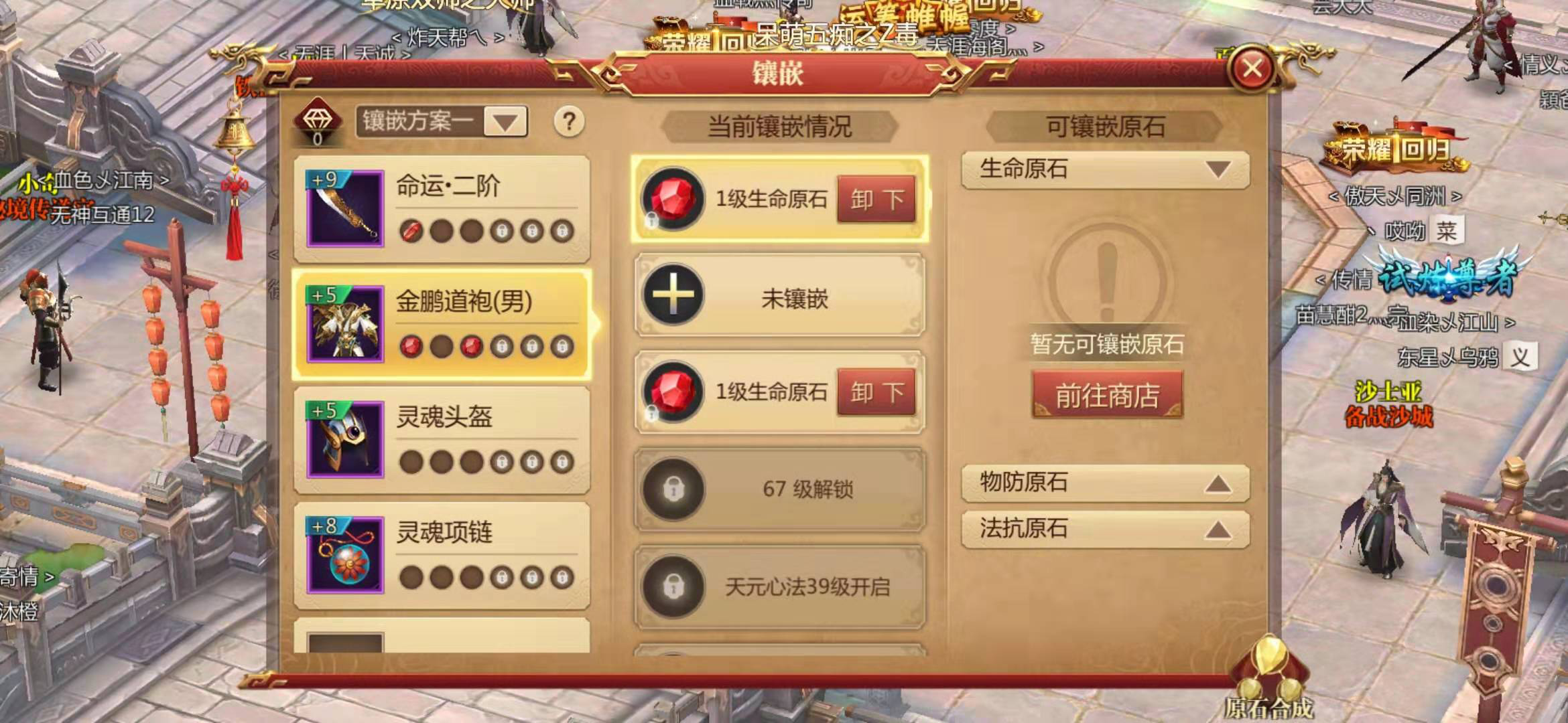 生命值和防御值还可以通过镶嵌原石来获得,原石是五行起源活动和五行秘境活动的产物,五行起源需要77级才能开启,所以我们最主要的获得原石途径还是五行秘境,挑战的层数越多获得的奖励越好,建议大家找行会里挑战的层数多的玩家一次组队,这样就可以越级挑战高层数了,得到的原石奖励自然也就越好。