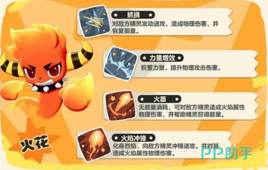 再来看看火花,这名字听着就让人热血沸腾。它的特性则更让人心跳加速——释放火系技能后,威力直接提升。这特性简单粗暴,没有任何花哨套路,就是让你打得更猛、更有快感!火花的技能组合也非常契合它的暴力风格:抓挠是低消耗的基础物理伤害技能,虽然简单,但能回血,非常实用。