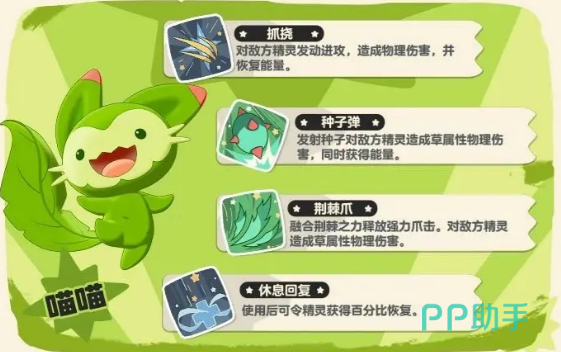 最后登场的是喵喵,这只呆萌又可爱的草系精灵,外表看似无害,但其实内核相当强大。喵喵的特性非常给力——释放草系技能时可以恢复生命值,这意味着它不仅打得你痛,还能自己奶自己,妥妥的小强属性。它的技能也是全能型的:抓挠和火花一样是基础攻击技能,但能回能量,用起来相当顺手。种子弹作为草系招牌技能,不仅输出稳健,还能提供能量回报,效果极佳。