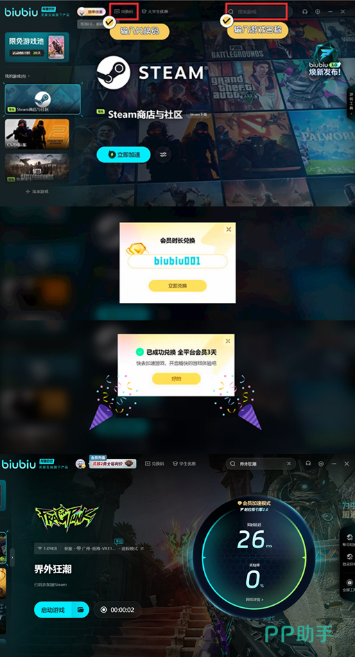在抽奖的过程中,还有机会拿到一些红色的货币,可以去购买金色的皮肤,武器,还有枪,一般抽取成功的概率是非常高的。与此同时,玩家也需要注意,要想在游戏中更好的体验就应该选择一款加速器,避免网络卡顿。现在新用户在下载加速器之后有一个3小时的礼包。另外还可以搭配兑换码【biubiu001】,获取72小时礼包,两者结合在一起,一共可以免费75小时。