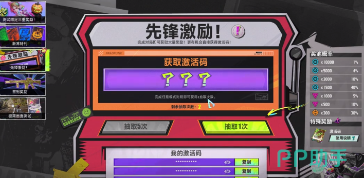 玩家在游戏的右下角,马上就可以进入到先锋基地。玩家可以根据对局的次数,然后去得到对应的抽奖次数,一般玩的越多则一位抽奖也就越多,此时就可以得到礼包码。