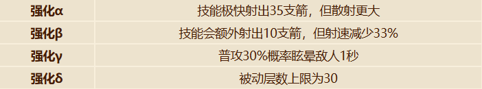 第二种是强化β,它的改造效果是技能额外射出10支箭,但射速减少33%。这种改造适合高血量BOSS战,打法更偏向精准打击。强化β让技能的箭数提升至30支,虽然射速有所降低,但每一支箭的威胁更大。