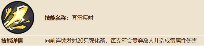 流光惊雷作为六星武器,自带雷电攻击属性,拥有80点基础攻击力和0.45秒的攻击间隔,这意味着你每秒可以输出多次高频雷电攻击,火力持续不断。更逆天的是其被动效果:每次普攻命中敌人都会提升自身伤害2%,叠满20层就能让伤害提升40%!这意味着,只要你保持攻击,不断输出,你就是战场上的行走核弹。同时,【奔雷疾射】技能也极为强力:一口气发射20支强化雷电箭,箭箭贯穿敌人,雷电伤害直冲云霄。配合被动效果简直就是AOE清场神器。