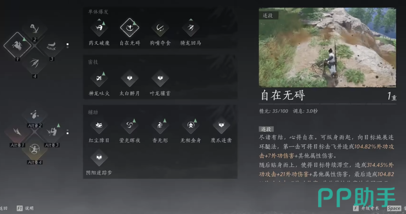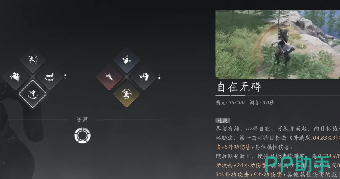 自在无碍是心法技能,总共会消耗玩家35点的精元,调息时间是三秒钟,自在无碍拥有连续攻击系哦啊过,在玩家对敌人施展了五段攻击时,攻击倍率加成将会从原来的100%外攻加点,增加到140%以及150%,并且还会附带有8点、24点、36点的外功伤害属性值提升,是游戏当中比较常见的一个输出心法。