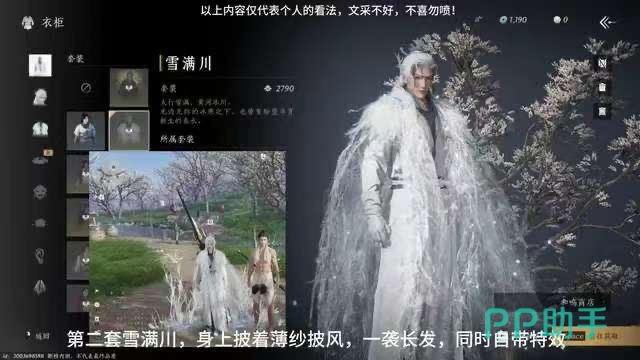 第二套叫雪满川,服装整体是雪白色的色调,偏清冷的风格,而且这件衣服是带披风的,游戏里面被风吹起的时候很好看,会增加一点朦胧感,同时还会带星星点点的特效,再搭配角色的一袭长发垂落肩头,这也是很多玩家都钟爱的一套衣服,小编建议有实力拿下的可以直接冲一把试试。