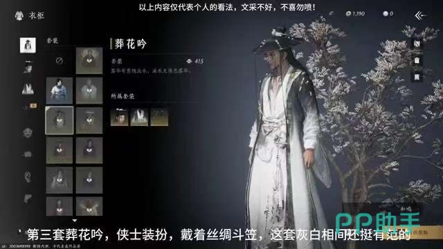 葬花吟这套主打的是黑白色调相间的,衣衫是水墨风格,再加上覆盖面纱的斗篷,很有一种大侠风范的气质,适合赶路的时候穿,和游戏中山水之间相得映彰,可以说是非常契合这个游戏主题了。