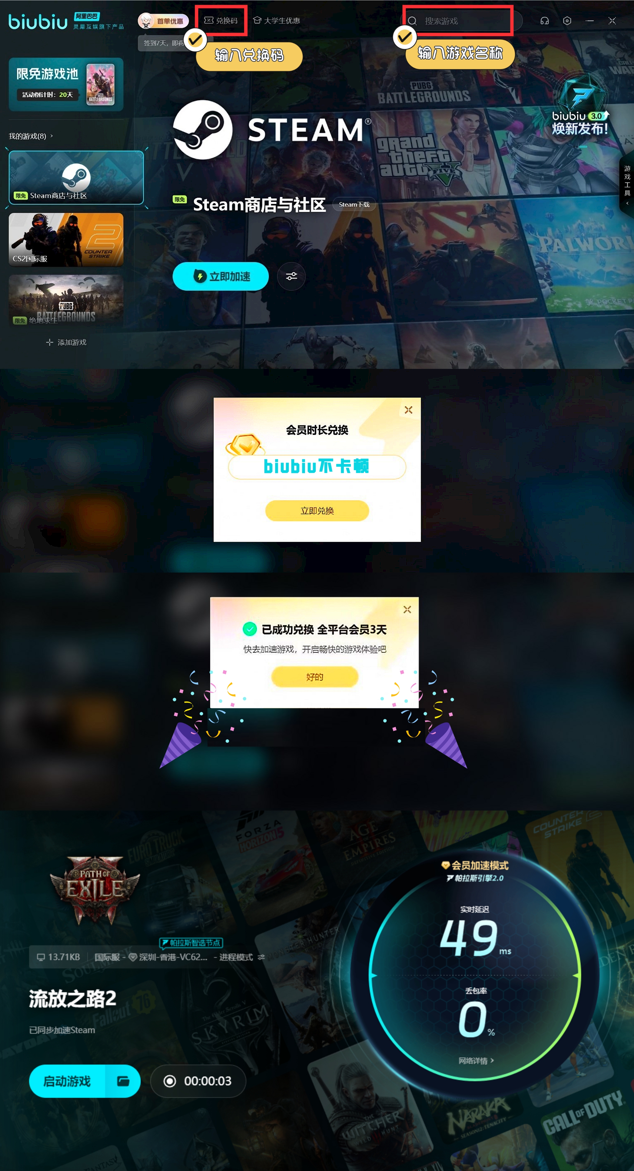虽然第整体剧情并不是很复杂,但是无论是维持车队运输还是打怪的环节强度都已经有一些上来,所以说灵敏的走位非常重要,其次就是电脑的延迟一定不能太高,否则即使天赋词条等等都很完美也不一定能打过,所以推荐大家使用一款加速工具,上面给大家安排的注册成为平台新用户就可以获得3小时免费加速时长,后续通过【biubiu不卡顿】可以再次获得72小时,目前该作品平台是支持免费体验加速效果的,赶快试试。