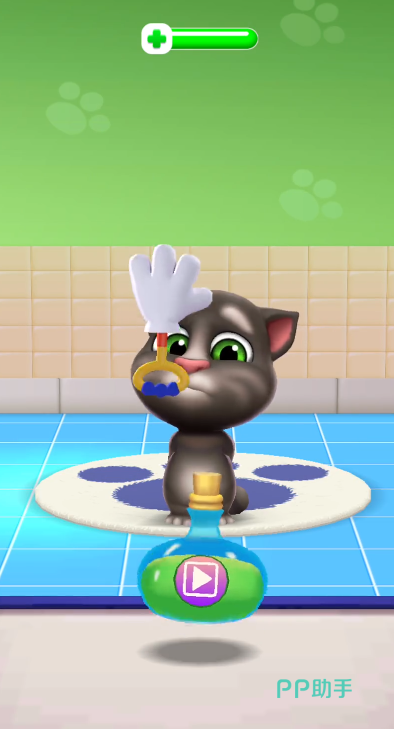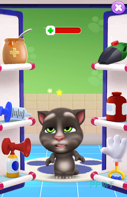 治疗中共有6种治疗道具,每种都能针对不同的症状进行治疗。玩家需要根据汤姆猫的表现判断病情,比如头晕时使用蜂蜜水,肚子疼时给它喝药剂,遇到外伤则用喷剂或清洗手套。如果不小心选择错了道具,没关系,汤姆猫会用手拒绝,你只需再尝试其他道具即可。一旦治疗完成,玩家就能获得飞行币,点击紫色的“X”按钮退出治疗,回到主界面,看到健康恢复的汤姆猫又活蹦乱跳啦!