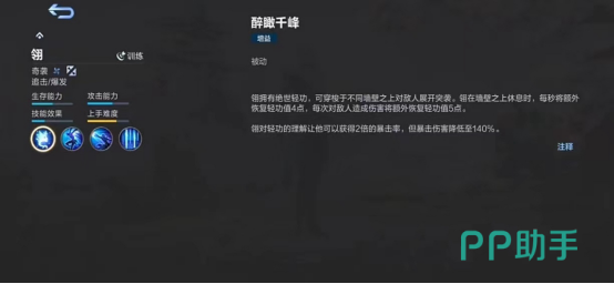他的技能分解后有一个很明显的特点,那就是比较依赖暴击所造成的伤害,所以他的技能几乎都能够去提升自身的暴击概率,他的1技能除了可以让他主动的用轻功飞到所有的墙壁上之外,还有着一个可以永久的去提升他2.5%的暴击率的被动,而且当翎飞到墙上时,还会进入半隐的状态,这种状态之下他是可以加速去恢复自己的轻功值和移速的,注意如果这时受到了伤害的话,会立即退出半隐的状态,被控了掉下来也会降低自己30%的移速。