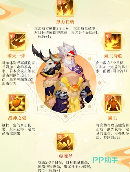 除了此群体技能之外,还有两个单体技能,包括魔王降临以及破一斧,前者的暴击率极高,能够快速攻击敌方三个目标,附加极高的暴击率前置两回合。后者拥有极强的单体爆发能力,对单体造成高额伤害,触发暴击率之后会额外追加一次,最多可触发两次具体的追击行为。