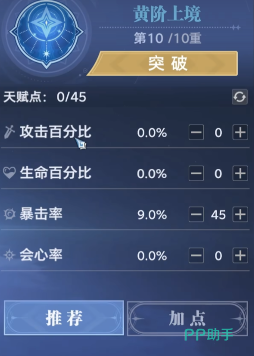 当我们的等级提升上去之后,就可以获得一些天赋点。这时可以将其加在攻击百分比上面,如果有剩下的话就全加在暴击率以及会心率。加攻击力百分比的话可以提升75.0战力评分,加暴击率的话,虽然能获得104的评分。