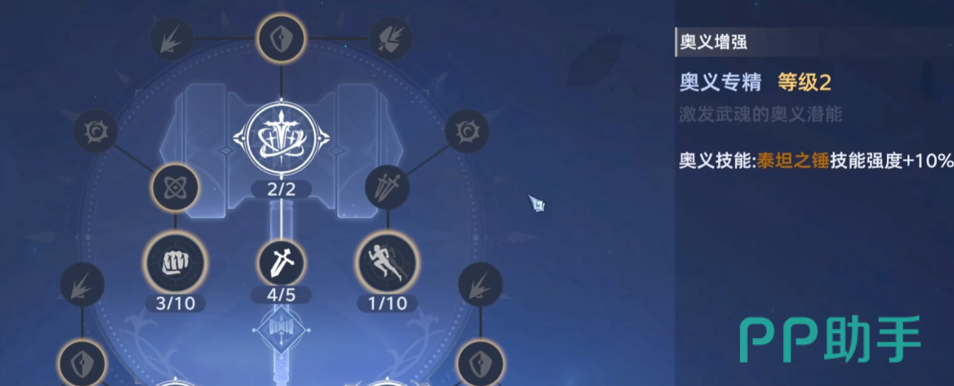 这里以昊天锤为原形来看,最好选择攻击专精,从而有效增强攻击力。然后再点击能够增加昊天锤额外伤害的会心伤害,也就是所谓的暴击伤害。然后这些大节点都是加被动以及奥义技能加强,例如增加泰坦之锤的技能强度,让你轻松打出高爆发伤害,所以我们不能一味的追求评分。