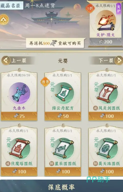 它的获取需要通过宗门宝库购买图纸,购买后再回到洞府内的器鼎中进行炼器,就可以得到了,这里有个省材小妙招,那就是大家每次炼制上品及以上材料的时候会获得灵气值,而这个数值到一定的时候可触发保底效果,当触发100%金色保底的时候,可以选择更低阶的炼器材料,这样概率并不会改变。