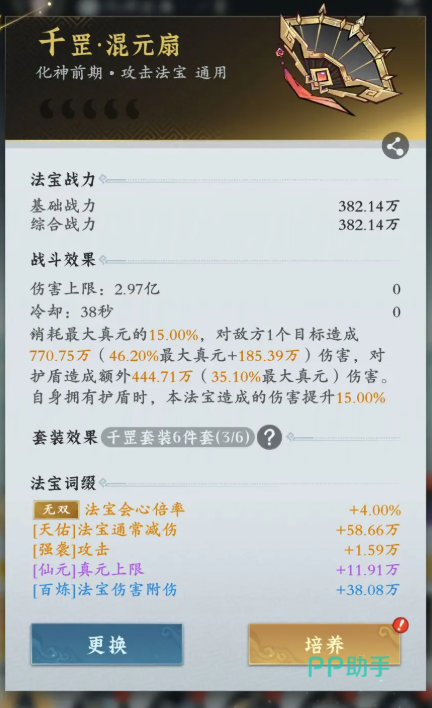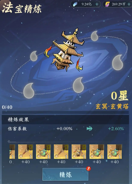 它有两种提升方式分别是淬炼和精炼,淬炼相当于升级,每提升一个级别都可以获得百分比的伤害加深或见面,精炼则相当于升阶,只有仙品阶的才可以精炼,需要消耗与其相对应类型的法宝,提升后攻击型增加伤害系数,防御型增加护盾系数。