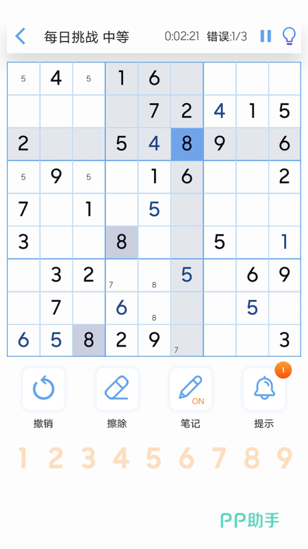 《九宫格数独:经典策略游戏》制作团队又全新加入了更多天马行空的设定,使得游戏的玩法更加的奇趣横生,并且有着高达千百种纷繁多变的九宫格关卡,且游戏界面设计的大观美方,加入了笔记、撤回、擦除等等能够加快游戏进程的设定,每一个关卡都有着错误的限制,因此玩家必须做到精准定位争取一步解答。
