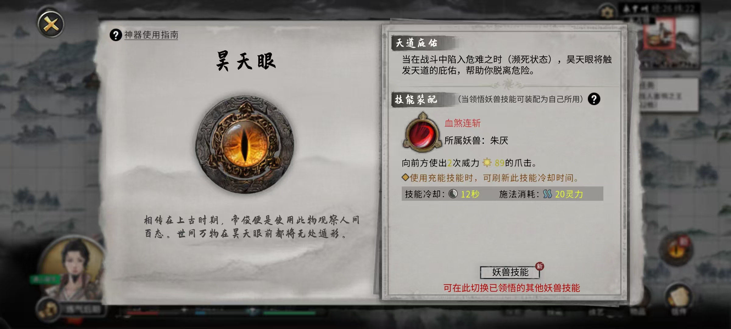 昊天眼在战斗中的另一重要功能是识破妖兽弱点。这种能力让它成为领悟妖兽技能的关键工具。当昊天眼发现并标记妖兽的弱点后,击破这一点即可成功领悟该妖兽的技能。领悟的技能还可以进行突破。当玩家集齐五个更高境界的妖兽技能时,还可以再进行突破,使玩家获得更强大的战斗能力。然而,当昊天眼进入破损状态时,玩家将无法使用装配的妖兽技能,甚至不能再次发动天道庇佑,但仍可继续领悟新的妖兽技能。