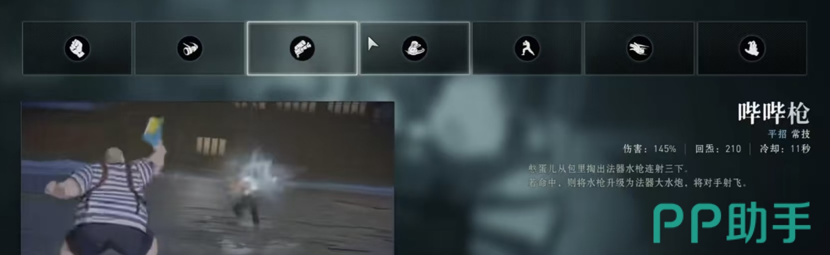 只要命中敌人,就可以让自己的发际变大,然后抡起它旋转三圈,就可以猛烈的攻击敌人,把他轰飞,笔笔枪是它的第二个技能,可以使用自己的法器水枪来连续新的攻击敌人三次,只要命中对手,就可以把水枪升级为大水炮,可以直接将对手击飞,但是这个技能的冷却时间比较长,足足有11秒,这个角色的两个平招技能,的冷却时间都是相似的。