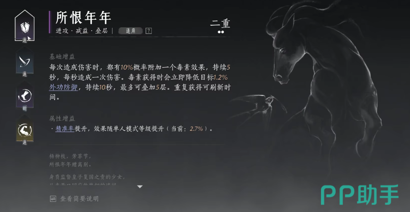 最后一个获取伤害倍率的方式是玩家学习功法,游戏内的心法和秘籍都是非常重要的收集环节,例如无名枪法可以增加伤害提升,不攻可以增加玩家的技能循环效率,而所恨年年和九阴真经可以通过增加技能伤害的方式,来增加基础攻击倍率。