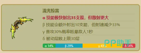 流光惊雷:作战的时候,普通攻击可以让敌人进入眩晕状态,在释放技能时,会额外的丢出十支箭,但是后续的箭矢速度回下降,如果技能极快射出35箭,则散射范围会更大。