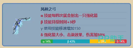 风神之弓:每射出4箭,就会额外射出1只强化箭;技能持续时间增加3秒;技能使用时,额外增加150点移速。
