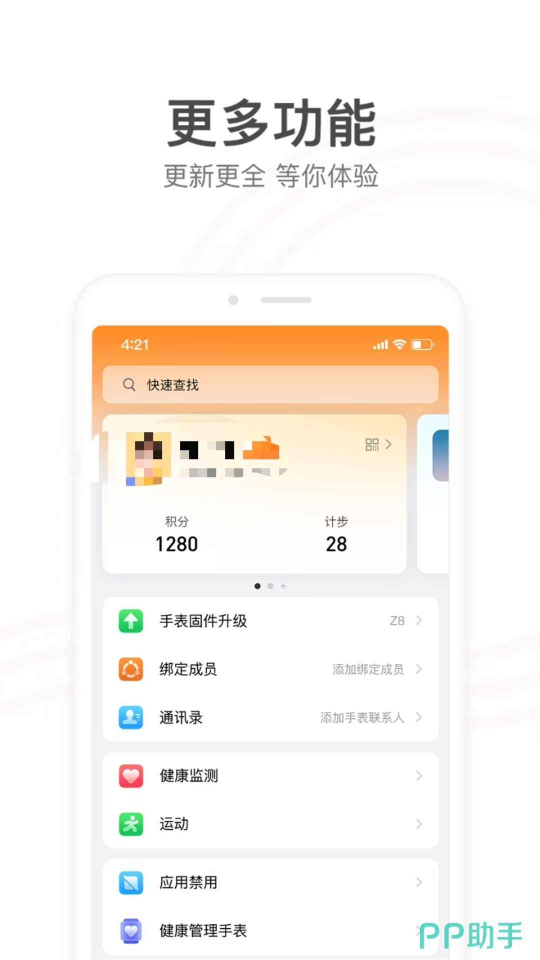 该软件具有消息提醒和闹钟等功能,可以提供24小时运动检测和健康服务。而且还能获得电话和短信等第三方应用通知,并且能够遥控手机摄像头进行拍照等。可以与自己的好友进行语音聊天和发送文字等,这样就可以增加朋友之间的沟通与交流。还可以实现移动支付功能,这样大家只需要在上面进行设置就可以了。