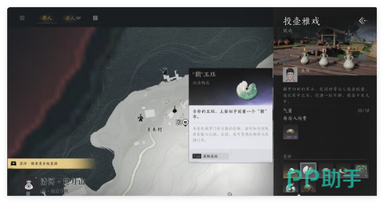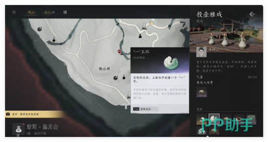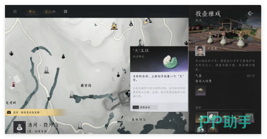 根据时一杯的指引,你需要收集四枚分别刻有“天”、“地”、“一”、“朝”四字的玉珏。这四枚玉珏不仅是开启狂澜门派大门的关键,更是证明你是否具备资格的试炼。这些玉珏散落在龙虎岭和慈心山院的隐秘角落,分别藏于那些不易察觉的地点。龙虎岭左下角的一片幽林中,阳光透过树叶洒下斑驳的光影,而玉珏就静静地躺在一块青苔覆盖的石头上;慈心山院左上角则是另一个玉珏的藏匿之地,光靠探索还远远不够,因为剩下的玉珏需要通过一项特别的活动投壶游戏来获得。