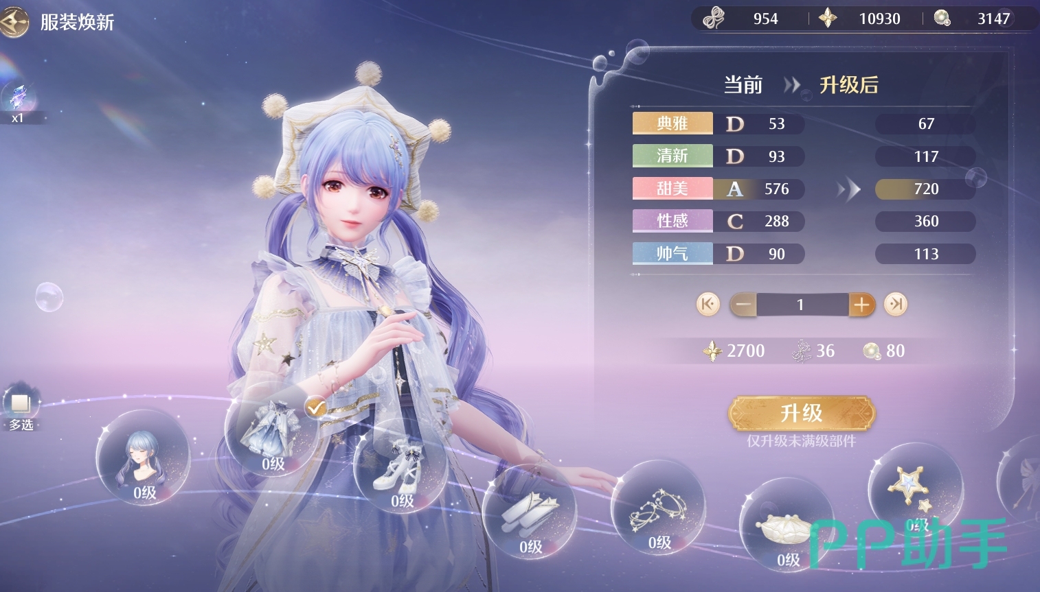 首先,小伙伴们需要找到自己想要升级的服饰套装,然后点击进去,之后会发现升级需要三样材料,分别是噗灵、丝线、还有闪亮泡泡。不过随着服饰等级的提升,大家的需求量越来越大,所以还是需要去慢慢积攒这些材料的。