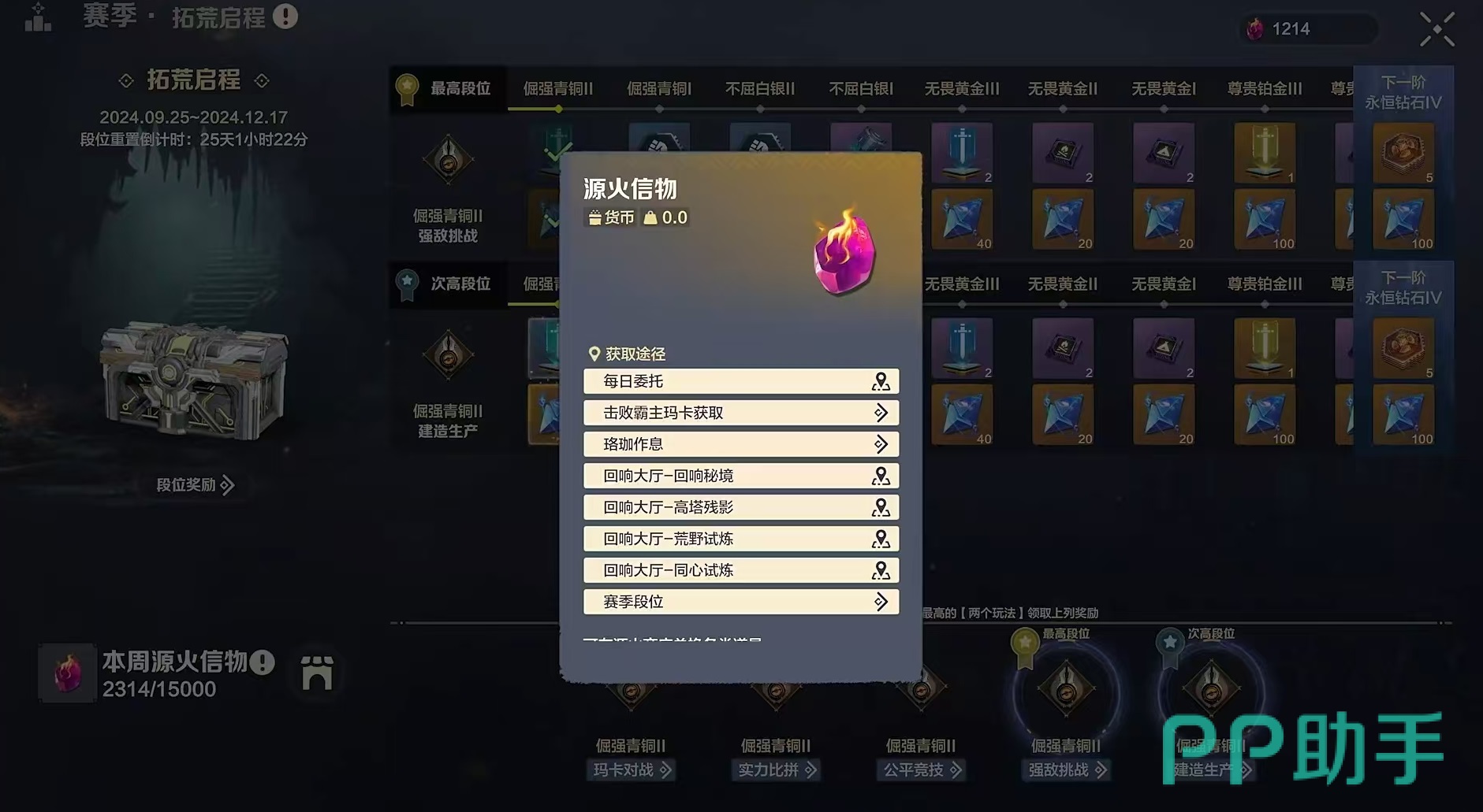 首先来介绍一下源火信物的获得方式,在主页面中打开功能入口,进入赛季界面,在赛季界面中可以查询当前所拥有的源火信物数量,和本周内所能获得的上限,毕竟这是有一定限制的游戏内货币,并不是可以无限制得到,每周都有相应上限。在获取规则方面,通过游戏中的各种玩法,都可以获得对应数量的源火信物,例如异境训练,噩梦挑战,公平竞技,实力挑战,委托任务等,都是如此。