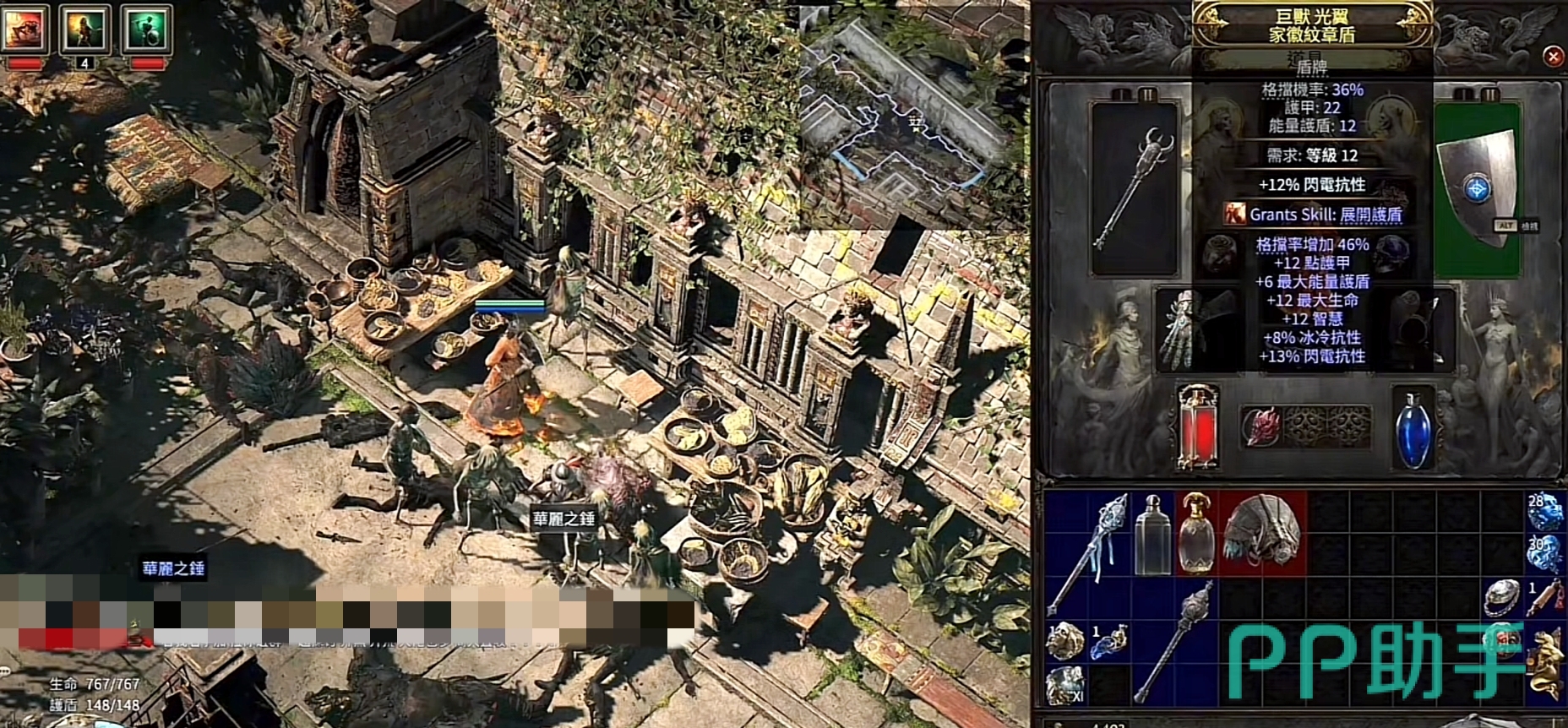 该职业的武器尽量要向带召唤物技能的靠拢,这里所选择的是恶行之曲法杖,所有的友军都能增加点伤的buff,一定要上一个盾牌可以选择巨兽光翼家辉纹章盾,选择需求少,然后格挡概率高的;现在刷怪的时候很容易被卡脚,滚不出去的时候就只能通过格挡来免伤。