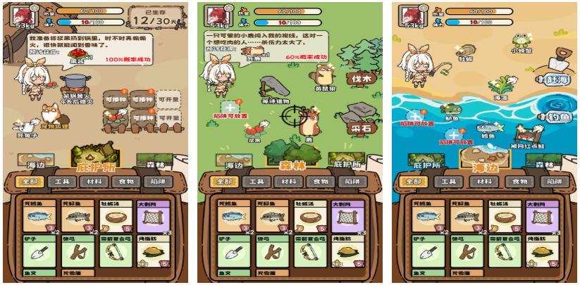 这是款融入了卡通可爱风格的荒野求生类竖屏游戏,刚开局你只能携带有限的生存工具,进入荒野地图求生,可以利用垂钓或者狩猎的方式获取食物让自己的健康值不掉,凶猛的野兽、饥饿和恶劣环境都会让大家生命值减少,只有不断获取荒野中的物资才能存活更久,极为细腻的场景细节塑造让这款生存手游更有代入感。