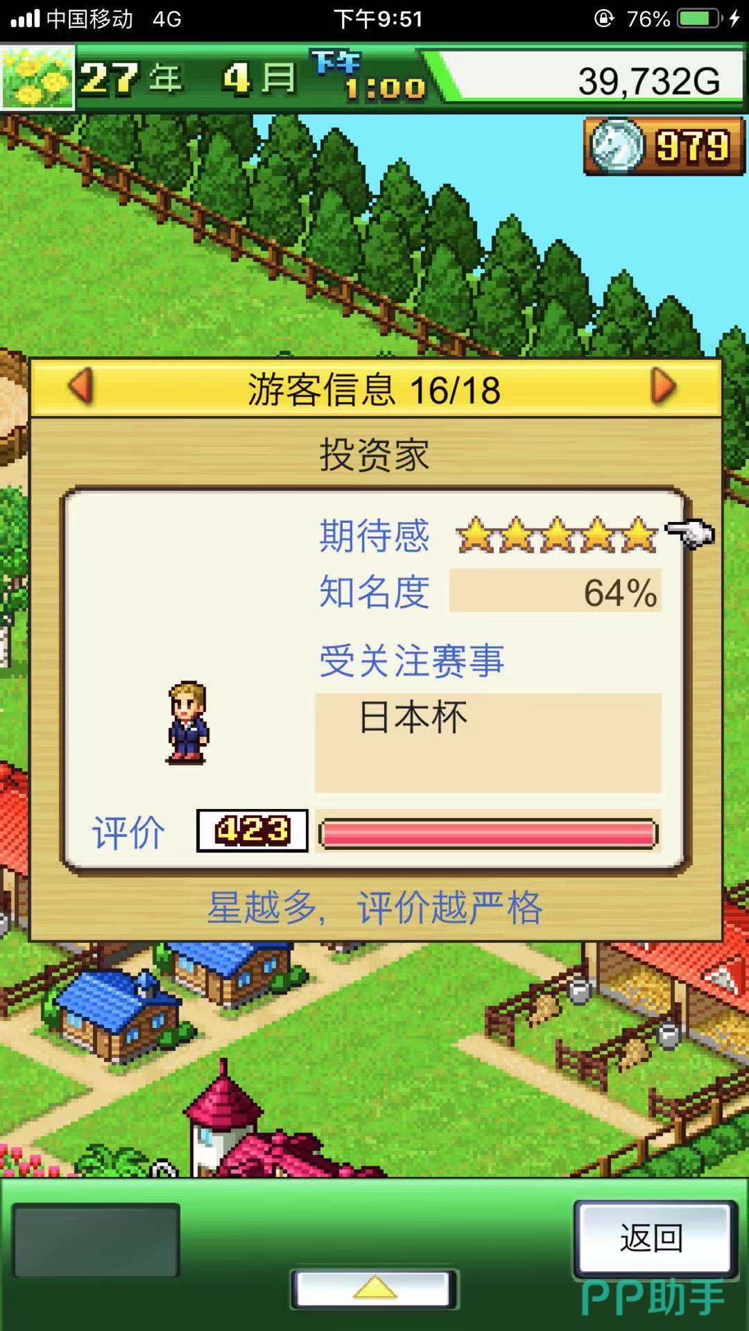 2.在马场修建一个可以增加游客评价的店铺,这个东西越早建越好,小编就是吃了不懂套路的亏,都26年了还没有把所有的马种全部解锁出来。游客来马场参观使用这些建筑就会增加好评度,但是不同的游客对店铺的品质要求不同,所以我们要频繁的使用道具给店铺增加品质。
