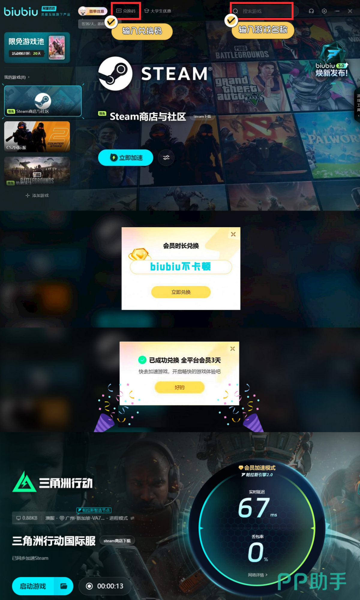 若是朋友们想要去解锁更多加速时长,那么可去输入口令【biubiu不卡顿】来进行领取,如此可成功拿到72小时加速机会,而对于广大的新人用户来说,叠加后亦可获取到75小时加速机会,而这个也是相当之给力。
