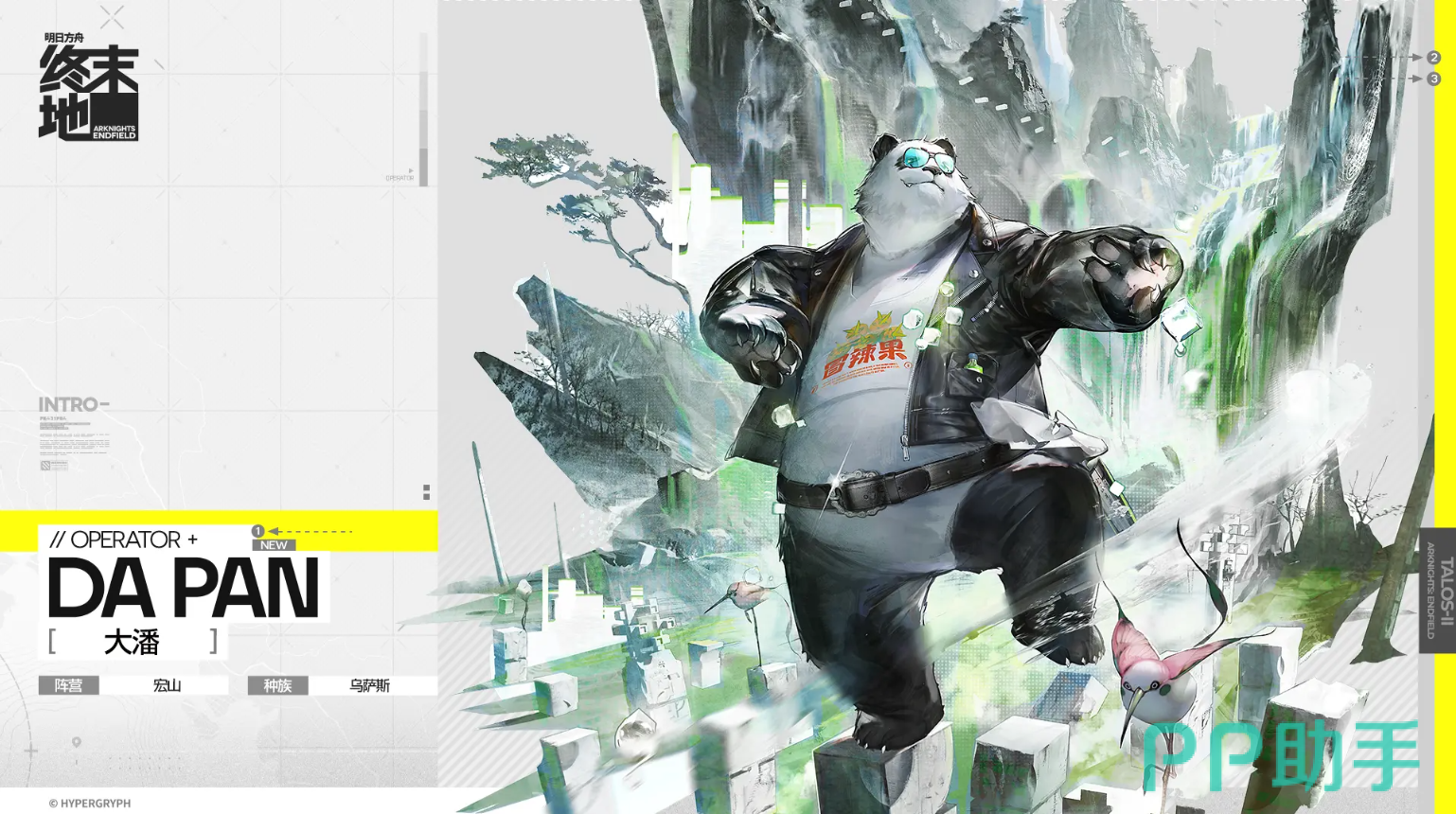 大潘是游戏中的一个新角色,是一只熊猫,非常帅气又带着点憨厚的形象。总是带着墨镜,背着一口锅。有点奇特又让人心生好奇的出场方式。之前在宏山科学院学习,来到终末工业工作由陈千语介绍,担任特派联络员。他曾经是一名自豪的先进科研工作者,现在也在从事热爱的大厨事业,做的食物都特别好吃。