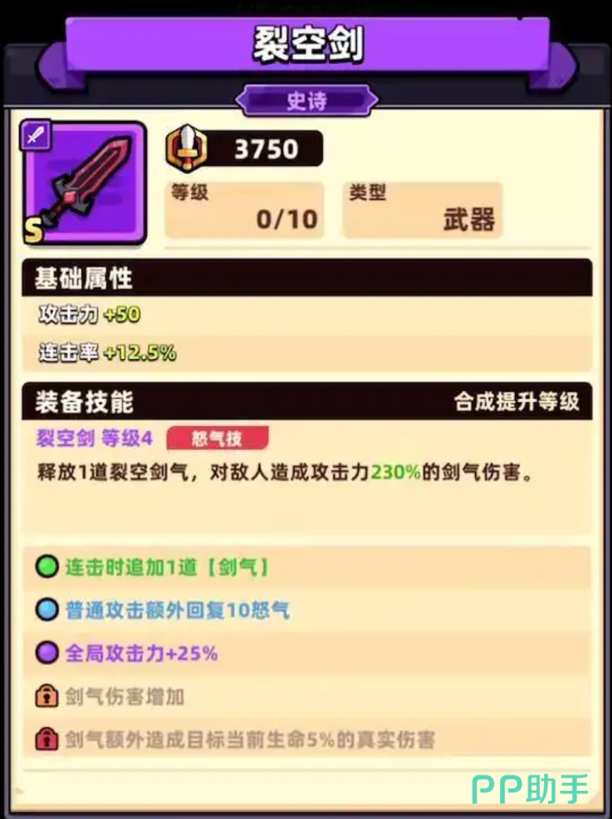 每次普通攻击的时候,裂空剑可以额外回收怒气值,这样能够帮助玩家快速的去释放技能,从而提高实力。其实裂空剑的基础属性就是它的高额伤害输出能力跟连击的效果。