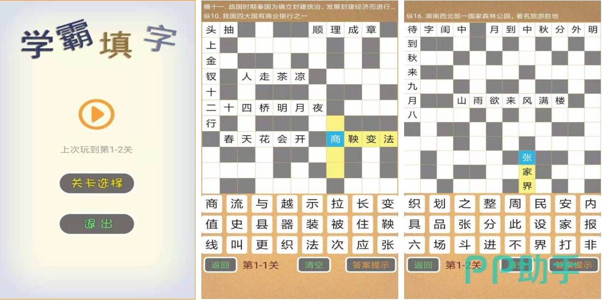 各位高智商的学霸们赶紧试试这款专门填字进行闯关的神作吧,本作采用了竖屏填写汉字的操作机制大大降低的操作难度,可自由选择不同的填字关卡完成填字闯关的任务,画面风格简约且音效也是古色古香吸引了不少粉丝,通过填字的方式完成各类任务也会给屏幕前的朋友带来一定的满足感。