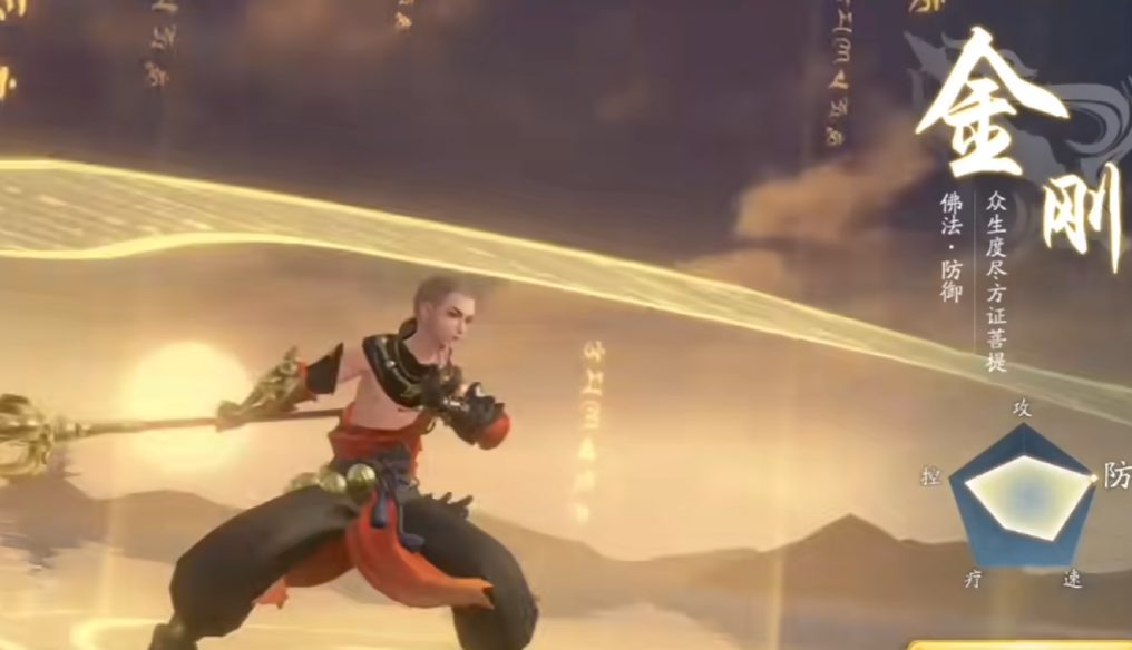第2个给大家推荐的是金刚,这是目前游戏里面唯一的一个坦克职业,因此在副本或者团战里面都占据着非常重要的地位,有它的存在,能够很大程度地给队伍延长整体的生存能力。同样是分为两个流派,一个是菩提,纯坦克流,可以给队友添加增益buff。一个是明王流。明王流兼顾了输出和防御,并且在施展技能的时候可以让自身处于霸体的状态。